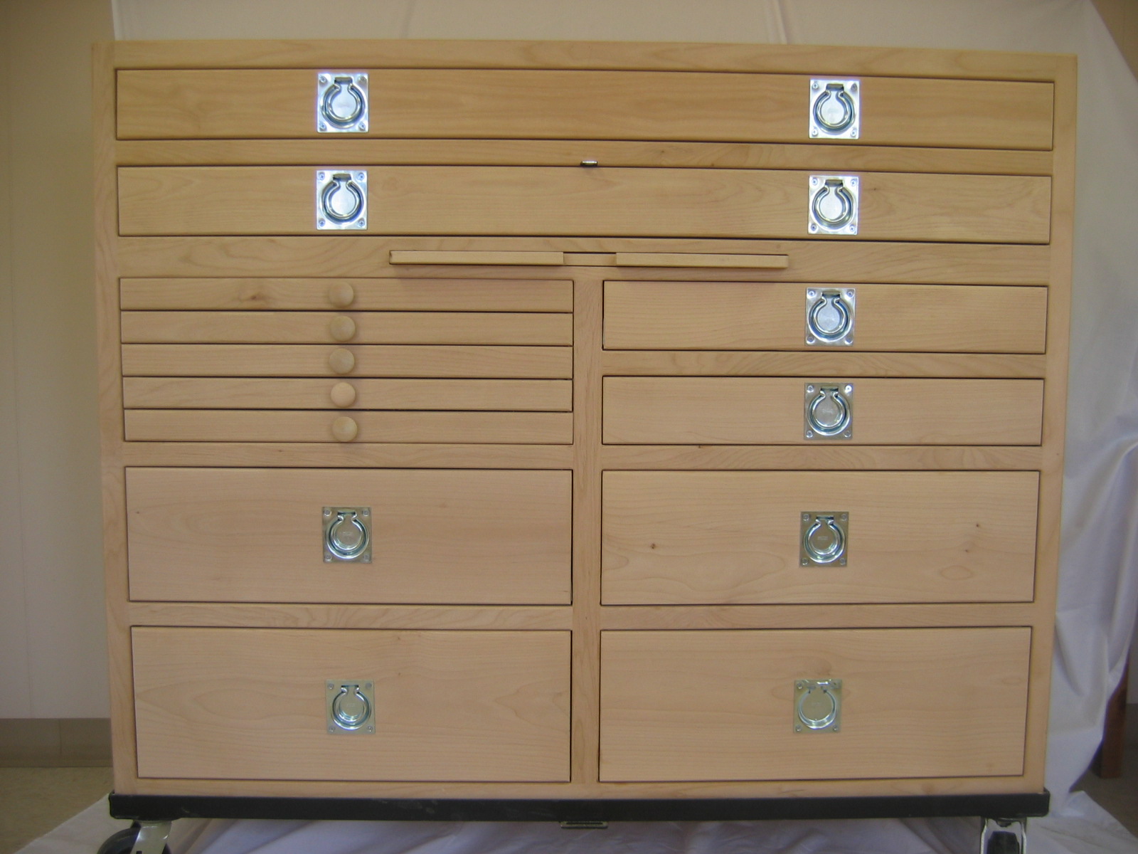 Based on the same footprint as the four foot standard unit, this unit has six standard drawers, plus five gel/prop drawers, and two lockable (wallet) drawers in work box designed to store and organize lighting gels as well as standard size drawers for work needs. It is a preferred box for propmasters and lighting gaffers!
